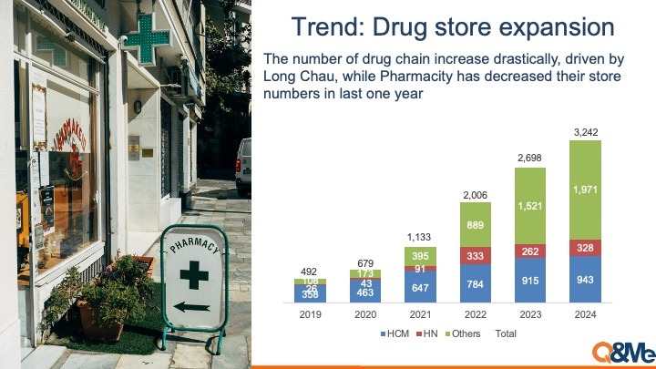 - ドラッグストアチェーン: ドラッグストアの数は2024年には3,200店以上に急増しました。「Long Chau」がその成長を牽引している一方で、「Pharmacity」は過去1年間に店舗数を減少させました。